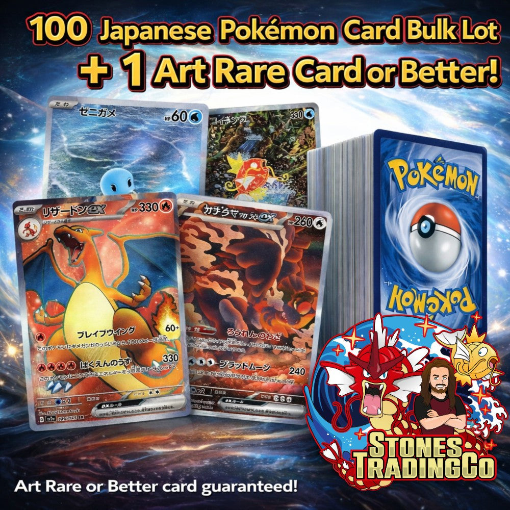 100 Japanese Pokémon Card Bulk Lot + 1 Guaranteed Art Rare (AR) or Better Expand your Pokémon collection with this exciting 100% authentic Japanese Pokémon card bundle! Perfect for collectors, players, and fans looking to add unique Japanese cards to their collection. What You Get • 100+ Authentic Japanese Pokémon Cards