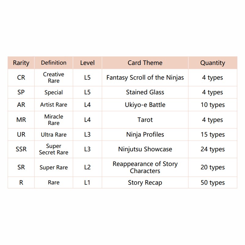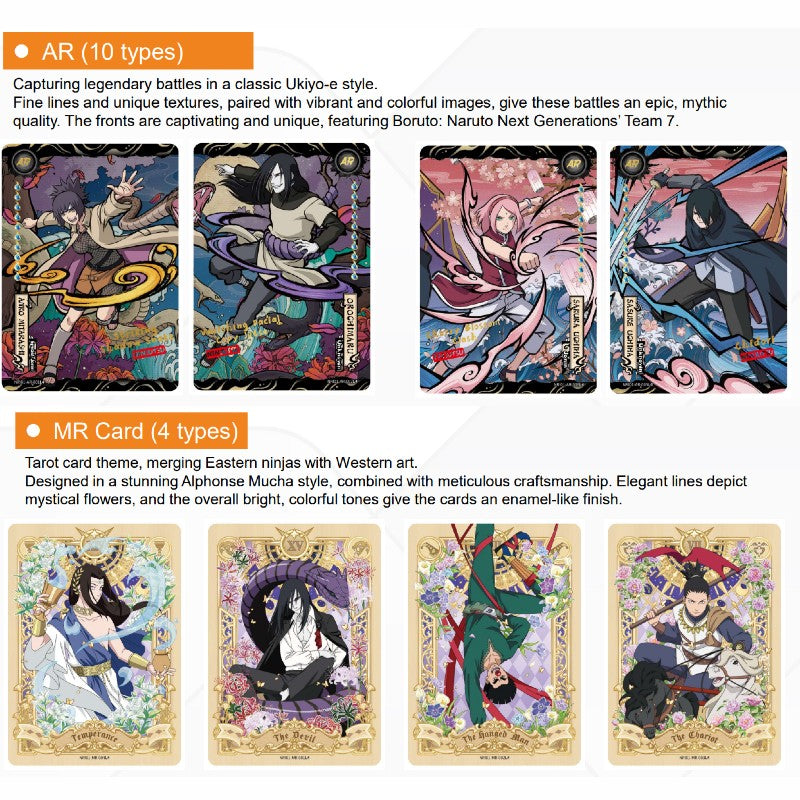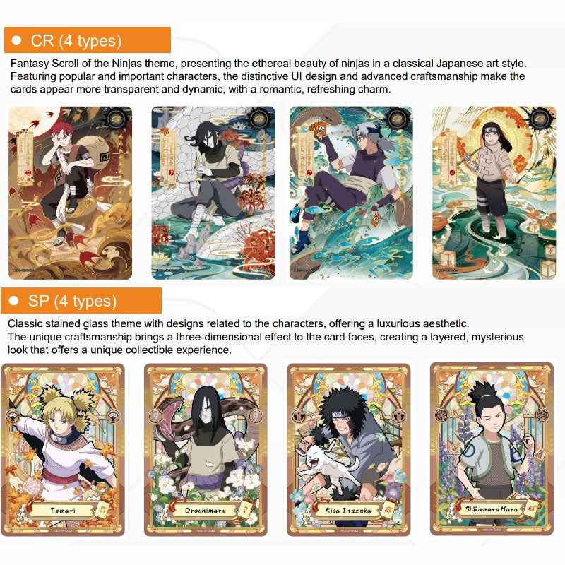 Chūnin Exams, Hidden Leaf Village Falls! NARUTO-Smriti Collectible Cards-Earth Scroll is here, making a stunning debut! This series is updated in line with the anime's main storyline, with this volume focusing on the thrilling events from the Chūnin Exams to Orochimaru's invasion of Leaf Village. The product's UI has been fully upgraded, now featuring comprehensive information about ninja techniques. The craftsmanship for the CR rarity has been improved, making the cards more dazzling and enhancing their collectible value. Additionally, a new AR rarity has been added, showcasing iconic battles in the unique style of Ukiyoe, offering a fresh and captivating experience. This series includes a total of 131 types of cards, divided into 8 rarities. With a completely redesigned card layout, many beloved characters make their appearance. The Earth Scroll also features new ninja characters from Boruto: Naruto Next Generations.